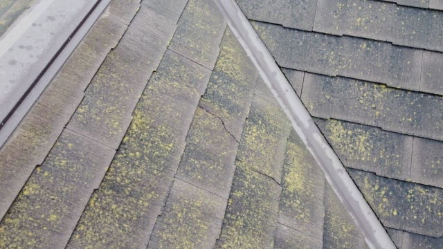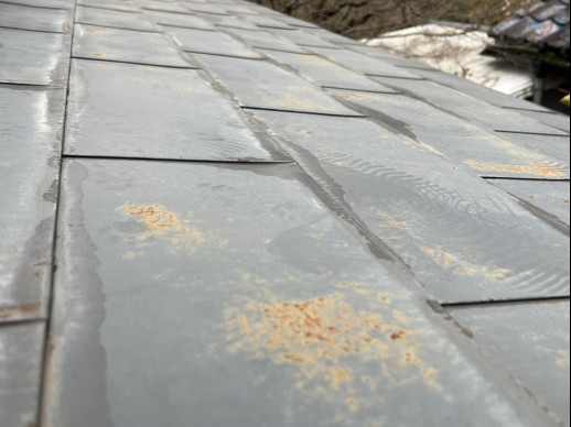 築10年以上経過している家の屋根には、コケやカビが発生している事が多いです。   そういった場所は雨水を吸収して水気を帯びている事が多く紫外線を受けると反り返しの原因になります。  |